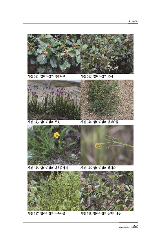 V. 부 록 www.nie.re.kr ?553 사진 641. 밖다리섬의 떡갈나무 사진 642. 밖다리섬의 모새 사진 643. 밖다리섬의 무릇 사진 644. 밖다리섬의 방석나물 사진 645. 밖다리섬의 벋음씀바귀 사진 646. 밖다리섬의 산해박 사진 647. 밖다리섬의 수송나물 사진 648. 밖다리섬의순비기나무