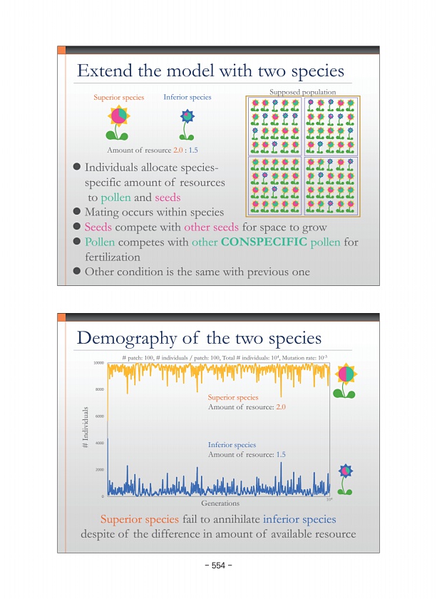 Demography of the two species 0 2000 4000 6000 8000 10000 # Individuals Generations Superior species fail to annihilate inferior species despite of the difference in amount of available resource Superior species Amount of resource2.0 Inferior species Amount of resource1.5 104 # patch100, # individuals patch100, Total # individuals104, Mutation rate10-3 Extend the model with two species Superior sp...