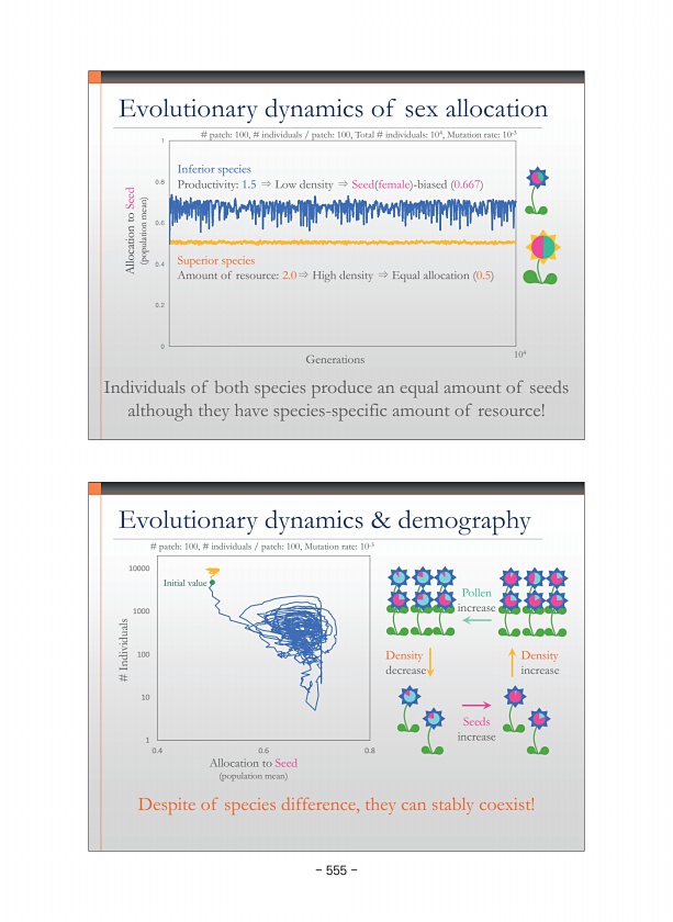 Evolutionary dynamics & demography Initial value Allocation to Seed population mean Despite of species difference, they can stably coexist! 1 10 100 1000 10000 0.4 0.6 0.8 # Individuals Seeds increase Pollen increase Density increase Density decrease # patch100, # individuals patch100, Mutation rate10-3 Evolutionary dynamics of sex allocation 0 0.2 0.4 0.6 0.8 1 Allocation to Seed population mean ...