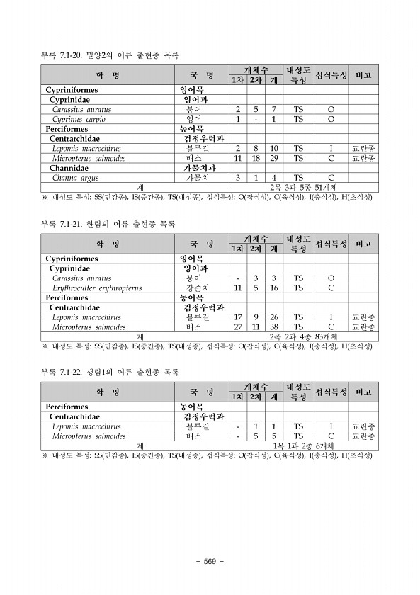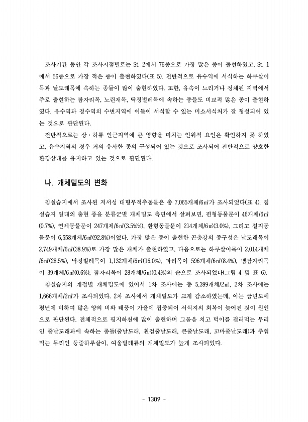1309 조사기간 동안 각 조사지점별로는 St. 2에서 76종으로 가장 많은 종이 출현하였고, St. 1 에서 56종으로 가장 적은 종이 출현하였다 표 5 전반적으로 유수역에 서식하는 하루살이 목과 날도래목에 속하는 종들이 많이 출현하였다. 또한, 유속이 느리거나 정체된 지역에서 주로 출현하는 잠자리목, 노린재목, 딱정벌레목에 속하는 종들도 비교적 많은 종이 출현하 였다. 유수역과 정수역의 수변지역에 이들이 서식할 수 있는 미소서식처가 잘 형성되어 있 는 것으로 판단된다. 전반적으로는 상·하류 인근지역에 큰 영향을 미치는 인위적 요인은 확인하지 못 하였 고, 유수지역의 경우 거의 유사한 종의 구성되어 있는 것으로 조사되어 전반적으로 양호한 환경상태를 유지하고 있는 것으로 판단된다. 나. 개체밀도의 변화 침실...