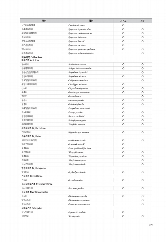 569 노란허리잠자리 Pseudothemis zonata ○ 고추좀잠자리 Sympetrum depressiusculum ○ ○ 두점박이좀잠자리 Sympetrum eroticum eroticum ○ ○ 깃동잠자리 Sympetrum infuscatum ○ ○ 흰얼굴좀잠자리 Sympetrum kunckeli ○ ○ 애기좀잠자리 Sympetrum parvulum ○ 하나잠자리 Sympetrum speciosum speciosum ○ ○ 대륙좀잠자리 Sympetrum striolatum imitoides ○ 메뚜기목 Orthoptera 메뚜기과 Acrididae 방아깨비 Acrida cinerea cinerea ○ ○ 청분홍메뚜기 Aiolopus thalassinus tamulus ○ ○ 팔공산밑들이메뚜기 Anapo...