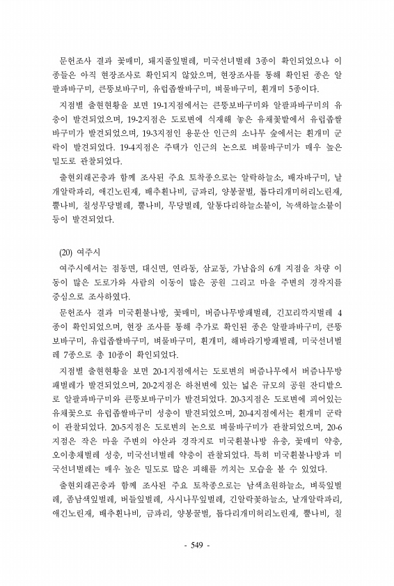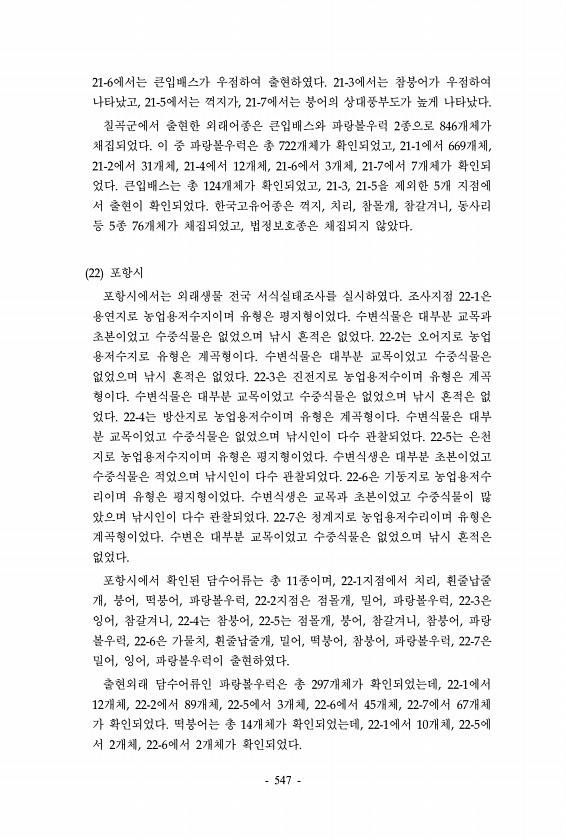 21-6에서는 큰입배스가 우점하여 출현하였다. 21-3에서는 참붕어가 우점하여 나타났고, 21-5에서는 꺽지가, 21-7에서는 붕어의 상대풍부도가 높게 나타났다. 칠곡군에서 출현한 외래어종은 큰입배스와 파랑볼우럭 2종으로 846개체가 채집되었다. 이 중 파랑볼우럭은 총 722개체가 확인되었고, 21-1에서 669개체, 21-2에서 31개체, 21-4에서 12개체, 21-6에서 3개체, 21-7에서 7개체가 확인되 었다. 큰입배스는 총 124개체가 확인되었고, 21-3, 21-5을 제외한 5개 지점에 서 출현이 확인되었다. 한국고유어종은 꺽지, 치리, 참몰개, 참갈겨니, 동사리 등 5종 76개체가 채집되었고, 법정보호종은 채집되지 않았다. 22 포항시 포항시에서는 외래생물 전국 서식실태조사를 실시하였다. 조사...