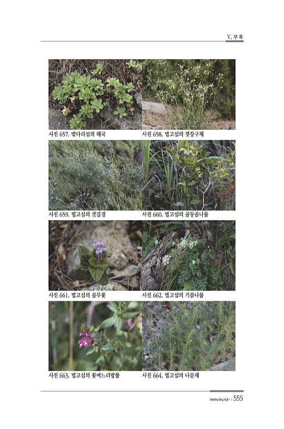 V. 부 록 www.nie.re.kr ?555 사진 657. 밖다리섬의 해국 사진 658. 법고섬의 갯장구채 사진 659. 법고섬의 갯길경 사진 660. 법고섬의 골등골나물 사진 661. 법고섬의 골무꽃 사진 662. 법고섬의 기름나물 사진 663. 법고섬의 꽃며느리밥풀 사진 664. 법고섬의나문재