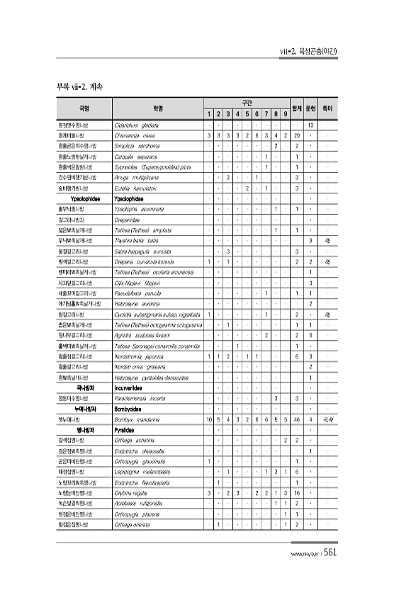 vii-2. 육상곤충 야간 www.nie.re.kr ?561 국명 학명 구간 합계 문헌 특이 1 2 3 4 5 6 7 8 9 흰점멧수염나방 Cidariplura gladiata 10 흰제비불나방 Chionarctia nivea 3 3 3 3 2 6 3 4 2 29 흰줄곧은띠수염나방 Simplicia xanthoma 2 2 흰줄노랑뒷날개나방 Catocala separans 1 1 흰줄썩은잎밤나방 Sypnoides Supersypnoides picta 1 1 긴수염비행기밤나방 Anuga multiplicans 2 1 3 숲비행기밤나방 Eutelia hamulatrix 2...