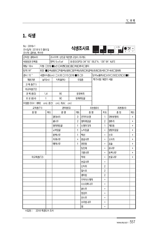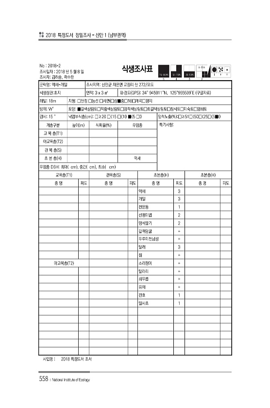V. 부 록 www.nie.re.kr ?557 1. No 2018-1 조사일자 2018 년 5 월 8 일 조사자김하송, 곽수란 식생조사표 군락명광대싸리 조사지역신안군 자은면 고장리 /두리도 식생상관관목림 면적5 x 5 ㎡ 위?경도 GPS 34° 55′ 50.3″N, 126° 01′ 4.0E 해발18m 지형□산정 ■능선 □사면 □상□중□하 □계곡□평지 방위W° 토양■갈색삼림토□적황색삼림토□암적색삼림토□회갈색삼림토□침식토□미숙토□암쇄토 경사15 ° 낙엽부식층 cm □≥20 □ 15 □ 10 ■ 5 □0 암석노출 % □≥51□ 50□ 25□ 5■0 계층구분 높이 m 식피율 % 우점종 특기사항해안가 식물 교 목 층 T1 아교목층 T2 관 목 층 S 1.4 95 광대싸리 초 본 층 H 1 90 청미래덩굴 우점종 DB...