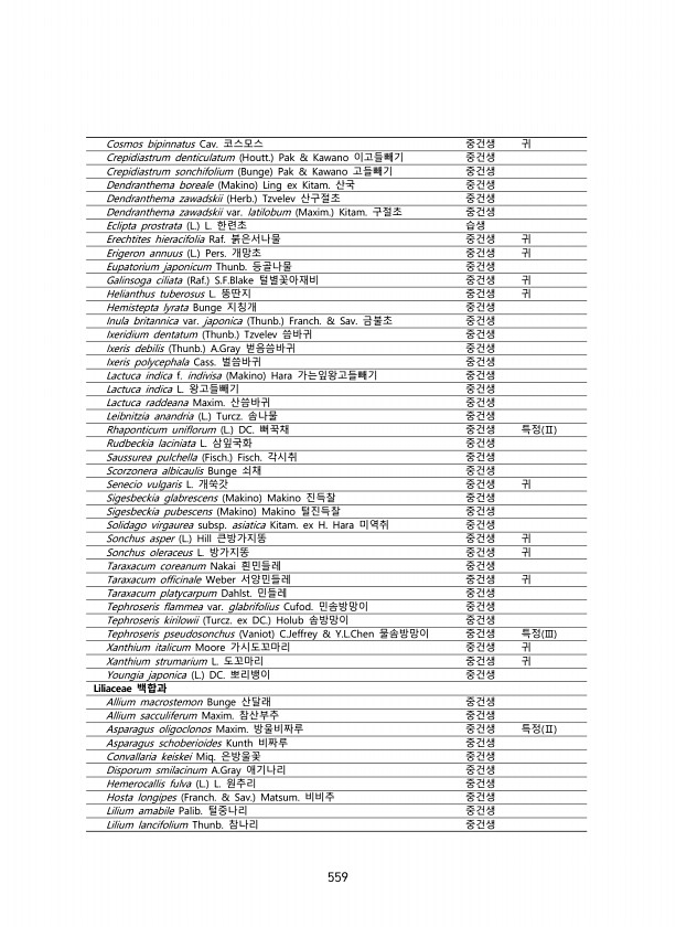 559 Cosmos bipinnatus Cav. 코스모스 중건생 귀 Crepidiastrum denticulatum Houtt. Pak & Kawano 이고들빼기 중건생 Crepidiastrum sonchifolium Bunge Pak & Kawano 고들빼기 중건생 Dendranthema boreale Makino Ling ex Kitam. 산국 중건생 Dendranthema zawadskii Herb. Tzvelev 산구절초 중건생 Dendranthema zawadskii var. latilobum Maxim. Kitam. 구절초 중건생 Eclipta prostrata L. L. 한련초 습생 Erechtites hieracifolia Raf. 붉은서나물 중건생 귀 Erigeron annuus L. Per...