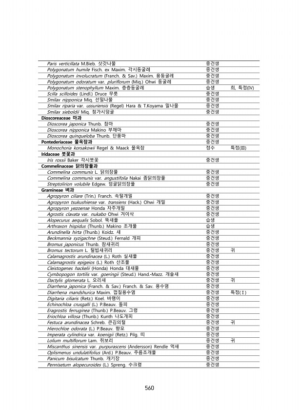 560 Paris verticillata M.Bieb. 삿갓나물 중건생 Polygonatum humile Fisch. ex Maxim. 각시둥굴레 중건생 Polygonatum involucratum Franch. & Sav. Maxim. 용둥굴레 중건생 Polygonatum odoratum var. pluriflorum Miq. Ohwi 둥굴레 중건생 Polygonatum stenophyllum Maxim. 층층둥굴레 습생 희, 특정 Ⅳ Scilla scilloides Lindl. Druce 무릇 중건생 Smilax nipponica Miq. 선밀나물 중건생 Smilax riparia var. ussuriensis Regel Hara & T.Koyama 밀나물 중건생 Smilax sieboldii Miq. ...