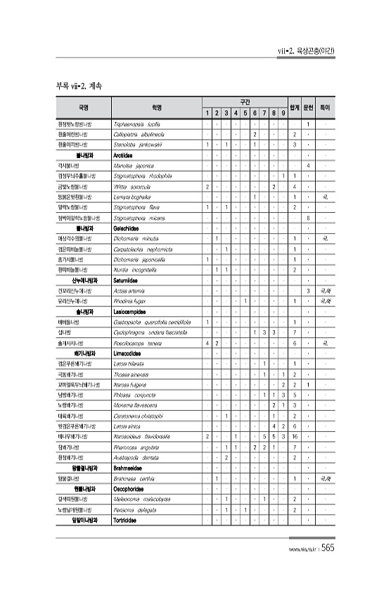 vii-2. 육상곤충 야간 www.nie.re.kr ?565 국명 학명 구간 합계 문헌 특이 1 2 3 4 5 6 7 8 9 흰점뒷노랑밤나방 Triphaenopsis lucilla 1 흰줄어린밤나방 Callopistria albolineola 2 2 흰줄이끼밤나방 Stenoloba jankowskii 1 1 1 3 불나방과 Arctiidae 각시불나방 Manulea japonica 4 검정무늬주홍불나방 Stigmatophora rhodophila 1 1 금빛노랑불나방 Wittia sororcula 2 2 4 등붉은뒷흰불나방 Lemyra boghaika ...