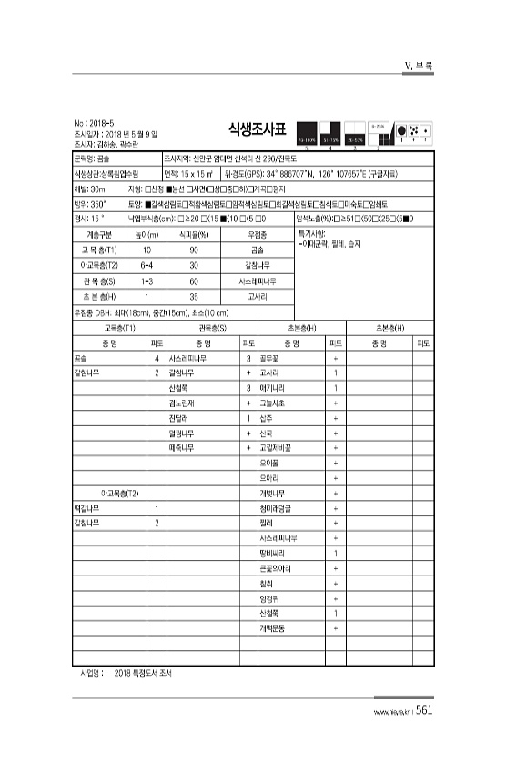 V. 부 록 www.nie.re.kr ?561 No 2018-5 조사일자 2018 년 5 월 9 일 조사자김하송, 곽수란 식생조사표 군락명곰솔 조사지역신안군 암태면 신석리 산 296/진목도 식생상관상록침엽수림 면적15 x 15 ㎡ 위?경도 GPS 34° 886707″N, 126° 107657E 구글자료 해발30m 지형□산정 ■능선 □사면 □상□중□하 □계곡□평지 방위350° 토양■갈색삼림토□적황색삼림토□암적색삼림토□회갈색삼림토□침식토□미숙토□암쇄토 경사15 ° 낙엽부식층 cm □≥20 □ 15 ■ 10 □ 5 □0 암석노출 % □≥51□ 50□ 25□ 5■0 계층구분 높이 m 식피율 % 우점종 특기사항-이대군락, 찔레, 습지 교 목 층 T1 10 90 곰솔 아교목층 T2 6-4 30 갈참나무 관 목 층 S ...