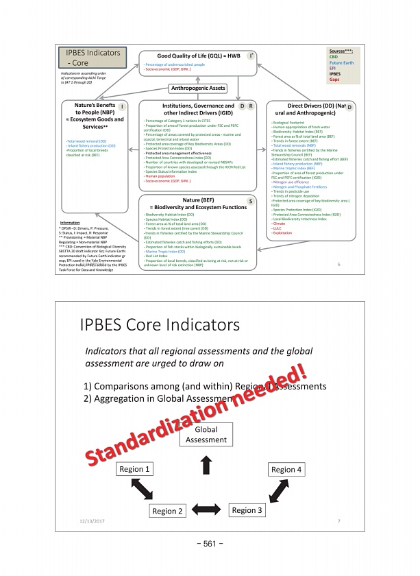 1 Comparisons among and within Regional Assessments 2 Aggregation in Global Assessment Region 1 Region 2 Region 3 Region 4 Global Assessment Indicators that all regional assessments and the global assessment are urged to draw on IPBES Core Indicators 12/13/2017 7 Direct Drivers DD Nat ural and Anthropogenic Ecological Footprint Human appropriation of fresh water Biodiversity Habitat Index BEF Fore...