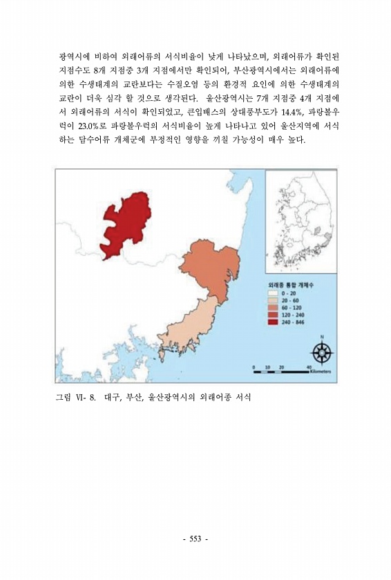 광역시에 비하여 외래어류의 서식비율이 낮게 나타났으며, 외래어류가 확인된 지점수도 8개 지점중 3개 지점에서만 확인되어, 부산광역시에서는 외래어류에 의한 수생태계의 교란보다는 수질오염 등의 환경적 요인에 의한 수생태계의 교란이 더욱 심각 할 것으로 생각된다. 울산광역시는 7개 지점중 4개 지점에 서 외래어류의 서식이 확인되었고, 큰입배스의 상대풍부도가 14.4%, 파랑볼우 럭이 23.0%로 파랑볼우럭의 서식비율이 높게 나타나고 있어 울산지역에 서식 하는 담수어류 개체군에 부정적인 영향을 끼칠 가능성이 매우 높다. 그림 Ⅵ- 8. 대구, 부산, 울산광역시의 외래어종 서식 553