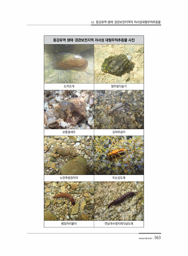 xi. 동강유역 생태·경관보전지역의 저서성대형무척추동물 www.nie.re.kr ?563 동강유역 생태·경관보전지역 저서성 대형무척추동물 사진 도끼조개 염주알다슬기 보통옆새우 강하루살이 노란측범잠자리 두눈강도래 뱀잠자리붙이연날개수염치레각날도래