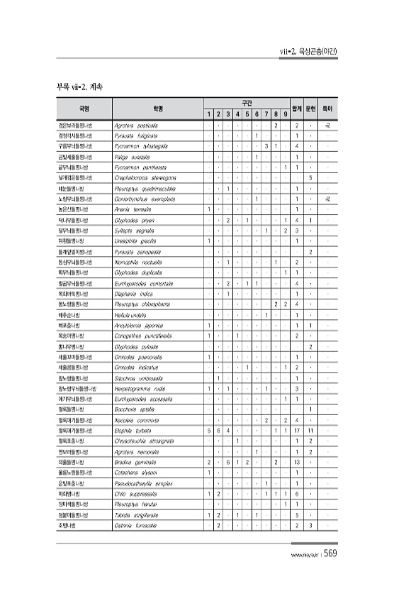 vii-2. 육상곤충 야간 www.nie.re.kr ?569 국명 학명 구간 합계 문헌 특이 1 2 3 4 5 6 7 8 9 검은보라들명나방 Agrotera posticalis 2 2 국. 검정각시들명나방 Pyrausta fuliginata 1 1 구름무늬들명나방 Pycnarmon tylostegalis 3 1 4 금빛세줄들명나방 Paliga auratalis 1 1 끝무늬들명나방 Pycnarmon pantherata 1 1 날개검은들명나방 Cnaphalocrocis stereogona 5 네눈들명나방 Pleuroptya quadrimaculalis...