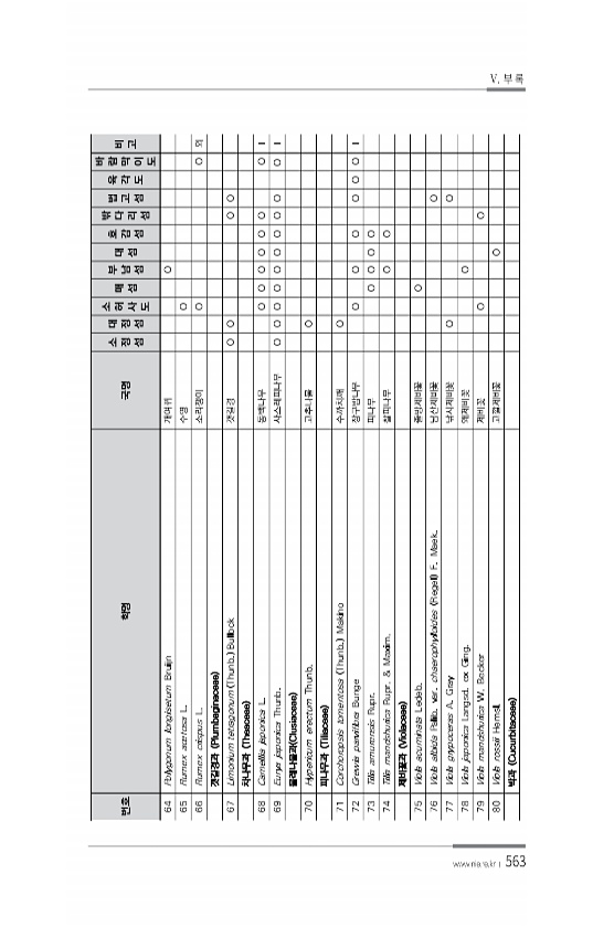 563 번호 학명 국명 소 정 섬 대 정 섬 소 허 사 도 매 섬 부 남 섬 대 섬 호 감 섬 밖 다 리 섬 법 고 섬 육 각 도 바 람 막 이 도 비 고 64 Polygonum longisetum Bruijn 개여뀌 O 65 Rumex acetosa L. 수영 O 66 Rumex crispus L. 소리쟁이 O O 외 갯길경과 Plumbaginaceae 67 Limonium tetragonum Thunb. Bullock 갯길경 O O O O 차나무과 Theaceae 68 Camellia japonica L. 동백나무 O O O O O O O Ⅰ 69 Eurya japonica Thunb. 사스레피나무 O O O O O O O O O O Ⅰ 물레나물과 Clusiaceae 70 Hypericum erectum...