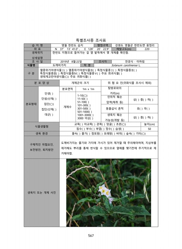 567 특별조사종 조사표 습 지 명 영월 한반도 습지 행정구역 강원도 영월군 한반도면 옹정리 좌 표 N 37˚ 13? 41.0? , E 128˚ 20? 22.9? 해발고도 m 220 생육위치 상세설명 한반도 지형으로 들어가는 길 옆 밭둑에서 몇 개체를 확인함. 조 사 일 2019년 8월 22일 조사자 천경식 · 이하림 식물명 도깨비가지 학 명 Solanum carolinense L. 구 분 멸종위기야생식물Ⅰ 멸종위기야생식물Ⅱ 특정식물종Ⅰ 특정식물종Ⅱ 특정식물종Ⅲ 특정식물종Ⅳ 특정식물종Ⅴ 주요 희귀식물 생태계교란야생식물 ○ 주요 귀화식물 분 포 양 상 개체군의 크기 위 협 요 인 귀화식물 조사시 제외 분포형태 단생 단생/산재 집단 ○ 집단/산재 대군 분포면적 1m x 1m 탐방로와의 거리 m 개체수 1-10 ...