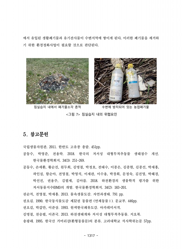 1317 에서 유입된 생활폐기물과 유기잔사물이 수변지역에 쌓이게 된다. 이러한 폐기물을 제거하 기 위한 환경정화사업이 필요할 것으로 판단된다. 침실습지 내에서 폐기물소각 흔적 수변에 방치되어 있는 농업폐기물 그림 7 침실습지 내의 위협요인 5. 참고문헌 국립생물자원관. 2011. 한반도 고유종 총람. 451pp. 공동수, 박영준, 전용락. 2018. 한국의 저서성 대형무척추동물 생태점수 개선. 한국물환경학회지. 34 3 251-269. 공동수, 손세환, 황순진, 원두희, 김명철, 박정호, 전태수, 이종은, 김종현, 김종선, 박재흥, 곽인실, 함순아, 전영철, 박영석, 이재관, 이수용, 박창희, 문정숙, 김진영, 박혜경, 박선진, 권용주, 김필재, 김아름. 2018. 하천환경의 생물학적 평가를 위한 저서동물지...