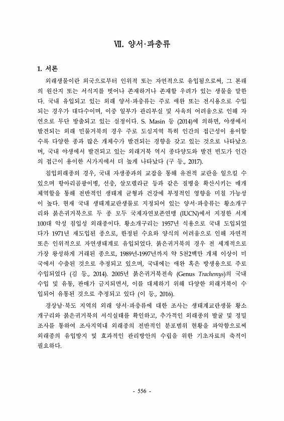 Ⅶ. 양서·파충류 1. 서론 외래생물이란 외국으로부터 인위적 또는 자연적으로 유입됨으로써, 그 본래 의 원산지 또는 서식지를 벗어나 존재하거나 존재할 우려가 있는 생물을 말한 다. 국내 유입되고 있는 외래 양서·파충류는 주로 애완 또는 전시용으로 수입 되는 경우가 대다수이며, 이중 일부가 관리부실 및 사육의 어려움으로 인해 자 연으로 무단 방출되고 있는 실정이다. S. Masin 등 2014 에 의하면, 야생에서 발견되는 외래 민물거북의 경우 주로 도심지역 특히 인간의 접근성이 용이할 수록 다양한 종과 많은 개체수가 발견되는 경향을 갖고 있는 것으로 나타났으 며, 국내 야생에서 발견되고 있는 외래거북 역시 종다양도와 발견 빈도가 인간 의 접근이 용이한 시가지에서 더 높게 나타났다 구 등., 2017 침입외래...