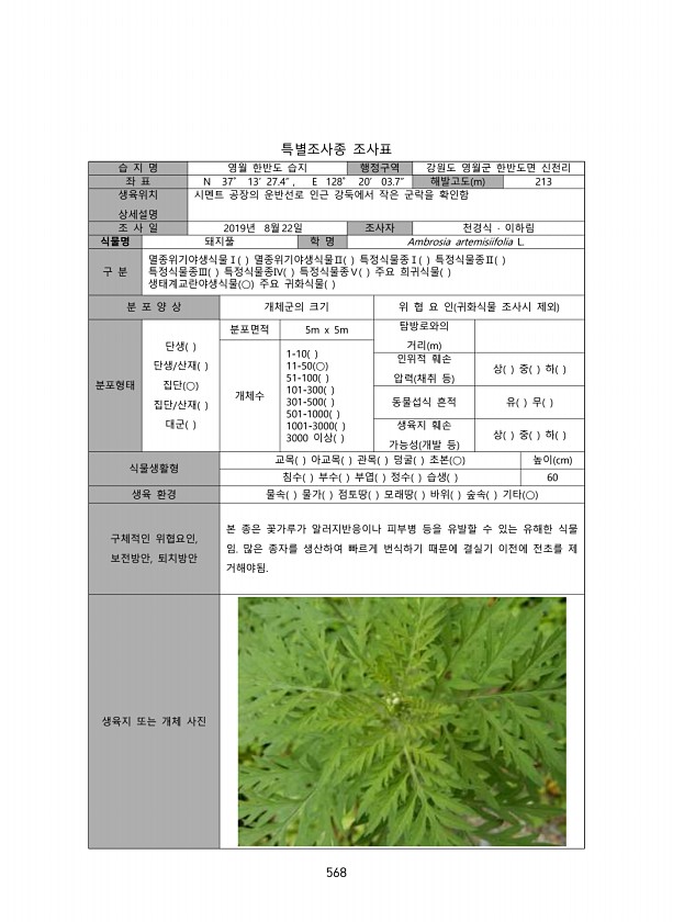 568 특별조사종 조사표 습 지 명 영월 한반도 습지 행정구역 강원도 영월군 한반도면 신천리 좌 표 N 37˚ 13? 27.4? , E 128˚ 20? 03.7? 해발고도 m 213 생육위치 상세설명 시멘트 공장의 운반선로 인근 강둑에서 작은 군락을 확인함 조 사 일 2019년 8월 22일 조사자 천경식 · 이하림 식물명 돼지풀 학 명 Ambrosia artemisiifolia L. 구 분 멸종위기야생식물Ⅰ 멸종위기야생식물Ⅱ 특정식물종Ⅰ 특정식물종Ⅱ 특정식물종Ⅲ 특정식물종Ⅳ 특정식물종Ⅴ 주요 희귀식물 생태계교란야생식물 ○ 주요 귀화식물 분 포 양 상 개체군의 크기 위 협 요 인 귀화식물 조사시 제외 분포형태 단생 단생/산재 집단 ○ 집단/산재 대군 분포면적 5m x 5m 탐방로와의 거리 m 개체수 1-10 ...