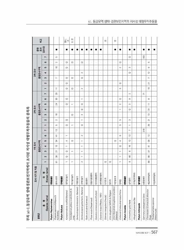 567 조사 시기 및 지점 분류군 1차 조사 2차 조사 3차 조사 문헌 조사 2013 중점조사구역 중점조사구역 중점조사구역 비고 종 명 Species name 국 명 Korean name 1 2 3 4 5 6 7 1 2 3 4 5 6 7 1 2 3 4 5 6 7 Phylum Platyhelminthes 편형동물문 Dugesia japonica Ichikawz & Kawakatsu 플라나리아 61 38 21 13 34 41 13 5 2 18 24 30 20 11 7 10 2 5 ● Phylum Mollusca 연체동물문 Koreanomelania nodifila Martens 염주알다슬기 1 Q Q 1 4 1 Q Q Q Q Q Q Q Q Q ● 멸Ⅱ, 고 Koreoleptoxi...