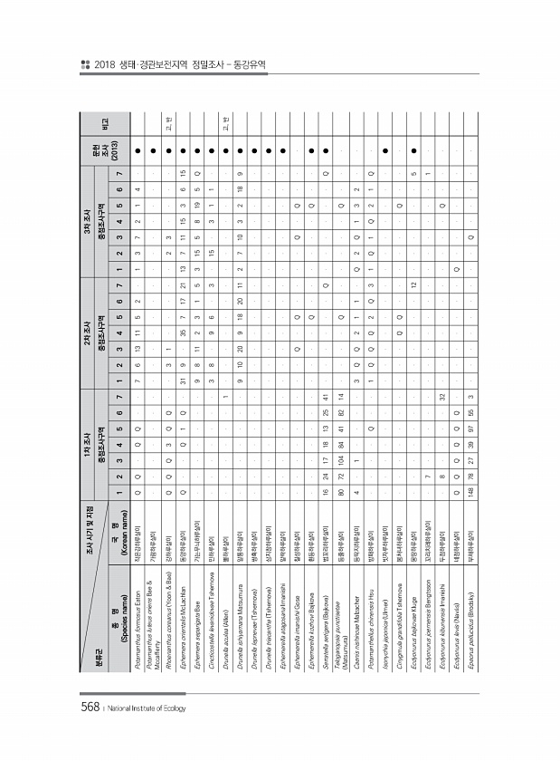 568 조사 시기 및 지점 분류군 1차 조사 2차 조사 3차 조사 문헌 조사 2013 중점조사구역 중점조사구역 중점조사구역 비고 종 명 Species name 국 명 Korean name 1 2 3 4 5 6 7 1 2 3 4 5 6 7 1 2 3 4 5 6 7 Potamanthus formosus Eaton 작은강하루살이 Q Q Q Q 7 6 13 11 5 2 1 3 7 2 1 4 ● Potamanthus luteus oriens Bae & Mccafferty 가람하루살이 ● Rhoenanthus coreanus Yoon & Bae 강하루살이 Q Q Q 3 Q Q 3 1 2 3 ...