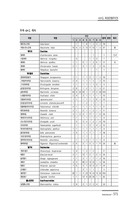 vii-2. 육상곤충 야간 www.nie.re.kr ?571 국명 학명 구간 합계 문헌 특이 1 2 3 4 5 6 7 8 9 메추리노린재 Aelia fieberi 1 1 8 1 2 3 2 18 썩덩나무노린재 Halyomorha halys 15 6 3 2 12 11 12 1 5 67 해. 매미과 Cicadidae 말매미 Cryptotympana atrata 1 1 기,국 쓰름매미 Meimuna mongolica 3 1 1 2 7 애매미 Meimuna opalifera 1 1 5 1 1 2 5 1 17 국. 참매미 Oncotympana fuscata 2 1 2 1 1 3 2 12 털매미 Platypleura kaempferi ...