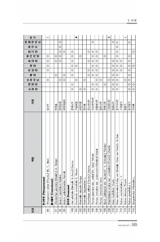 565 번호 학명 국명 소 정 섬 대 정 섬 소 허 사 도 매 섬 부 남 섬 대 섬 호 감 섬 밖 다 리 섬 법 고 섬 육 각 도 바 람 막 이 도 비 고 돈나무과 Pittosporaceae 96 Pittosporum tobira Thunb. W. T. Aiton 돈나무 O O O O O Ⅰ 돌나물과 Crassulaceae 97 Orostachys japonica Maxim. A. Berger 바위솔 O O O 98 Sedum oryzifolium Makino 땅채송화 O O O O O O 99 Sedum polytrichoides Hemsl. 바위채송화 O O O 장미과 Rosaceae 100 Aria alnifolia Siebold & Zucc. Decne. 팥배나무 O O O O O O O O 101 ...