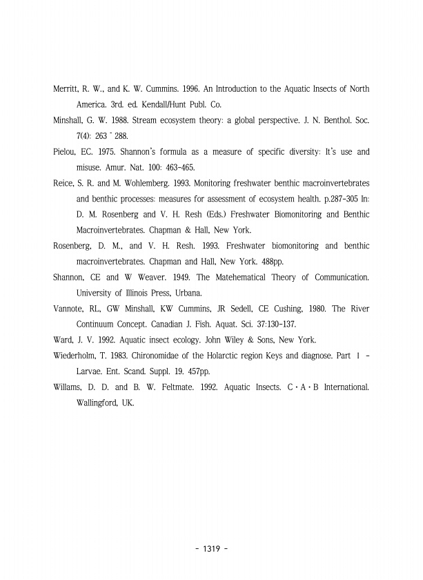 1319 Merritt, R. W., and K. W. Cummins. 1996. An Introduction to the Aquatic Insects of North America. 3rd. ed. Kendall/Hunt Publ. Co. Minshall, G. W. 1988. Stream ecosystem theorya global perspective. J. N. Benthol. Soc. 7 4 263~288. Pielou, EC. 1975. Shannons formula as a measure of specific diversityIts use and misuse. Amur. Nat. 100463-465. Reice, S. R. and M. Wohlemberg. 1993. Monitoring fres...