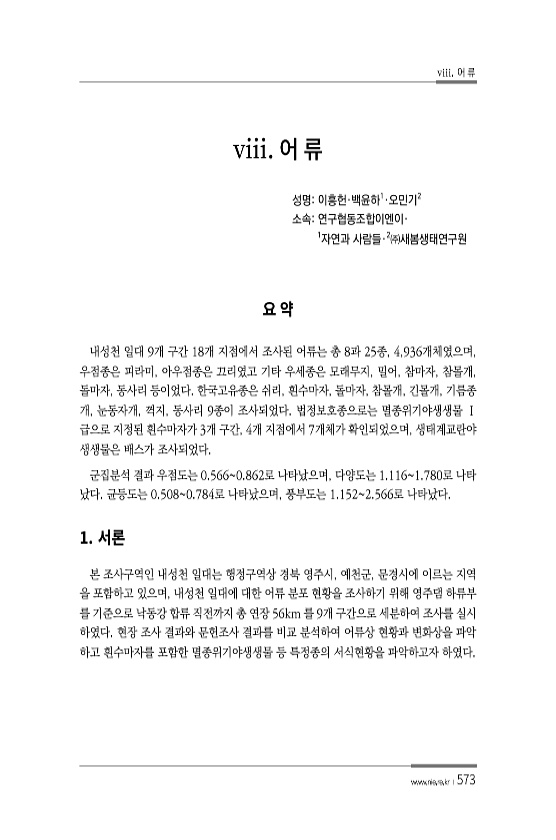 viii. 어 류 www.nie.re.kr ?573 viii. 성명이흥헌·백윤하1·오민기2 소속연구협동조합이엔이· 1자연과 사람들·2㈜새봄생태연구원 내성천 일대 9개 구간 18개 지점에서 조사된 어류는 총 8과 25종, 4,936개체였으며, 우점종은 피라미, 아우점종은 끄리였고 기타 우세종은 모래무지, 밀어, 참마자, 참몰개, 돌마자, 동사리 등이었다. 한국고유종은 쉬리, 흰수마자, 돌마자, 참몰개, 긴몰개, 기름종 개, 눈동자개, 꺽지, 동사리 9종이 조사되었다. 법정보호종으로는 멸종위기야생생물 Ⅰ 급으로 지정된 흰수마자가 3개 구간, 4개 지점에서 7개체가 확인되었으며, 생태계교란야 생생물은 배스가 조사되었다. 군집분석 결과 우점도는 0.5660.862로 나타났으며, 다양도는 1.1161.780로 나타 ...