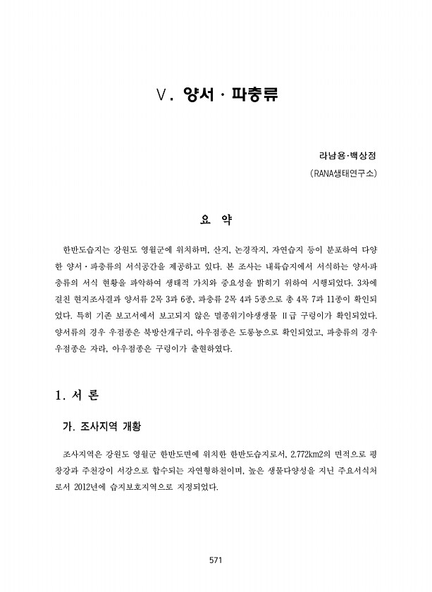 571 Ⅴ. 양서·파충류 라남용·백상정 RANA생태연구소 요 약 한반도습지는 강원도 영월군에 위치하며, 산지, 논경작지, 자연습지 등이 분포하여 다양 한 양서·파충류의 서식공간을 제공하고 있다. 본 조사는 내륙습지에서 서식하는 양서?파 충류의 서식 현황을 파악하여 생태적 가치와 중요성을 밝히기 위하여 시행되었다. 3차에 걸친 현지조사결과 양서류 2목 3과 6종, 파충류 2목 4과 5종으로 총 4목 7과 11종이 확인되 었다. 특히 기존 보고서에서 보고되지 않은 멸종위기야생생물 Ⅱ급 구렁이가 확인되었다. 양서류의 경우 우점종은 북방산개구리, 아우점종은 도롱뇽으로 확인되었고, 파충류의 경우 우점종은 자라, 아우점종은 구렁이가 출현하였다. 1. 서 론 가. 조사지역 개황 조사지역은 강원도 영월군 한반도면에 위치한...