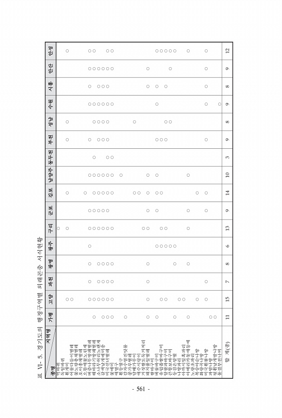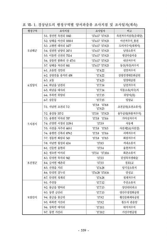 표 Ⅶ- 1. 경상남도의 행정구역별 양서파충류 조사지점 및 조사일자 계속 행정구역 조사지점 조사일자 비고 5.남해군 5-1. 창선면 옥천리 1042 ‘17.6.17 ‘17.9.23 옥천저수지상류 운대암 5-2. 남해읍 아산리 1010-1 ‘17.6.17 ‘17.9.23 아산저수지_봉천 5-3. 고현면 대곡리 1477 ‘17.6.17 ‘17.9.23 도마저수지 대계지 5-4. 설천면 남양리 247-1 ‘17.6.17 ‘17.9.23 남양소류지 5-5. 이동면 신전리 752-4 ‘17.6.17 ‘17.9.23 앵강다숲마을 5-6. 삼동면 봉화리 산 473-1 ‘17.6.17 ‘17.9.23 내산저수지 5-7. 남해읍 차산리 841 ‘17.6.17 ‘17.9.23 동산 차산 저수지 6.밀양시 6-1. 초동면 성만...
