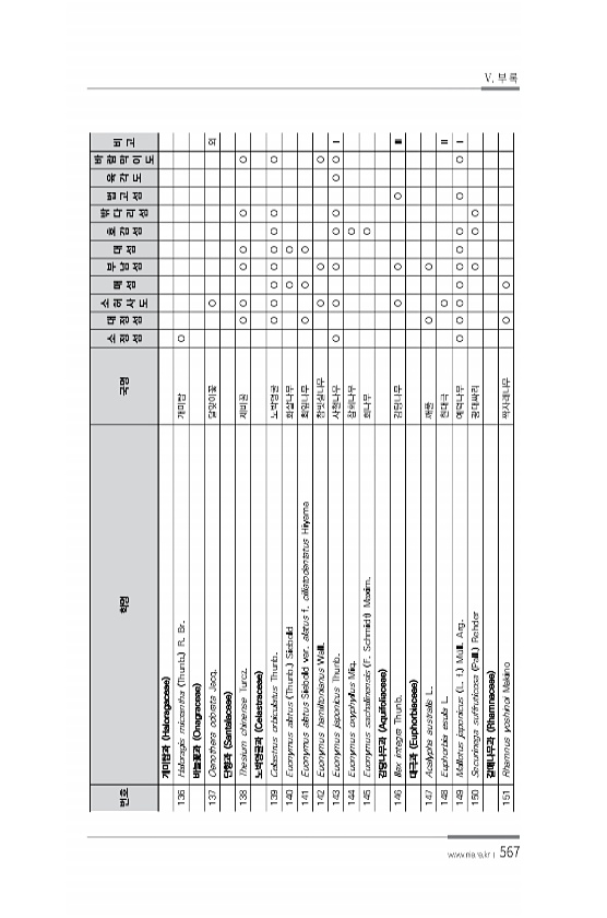 567 번호 학명 국명 소 정 섬 대 정 섬 소 허 사 도 매 섬 부 남 섬 대 섬 호 감 섬 밖 다 리 섬 법 고 섬 육 각 도 바 람 막 이 도 비 고 개미탑과 Haloragaceae 136 Haloragis micrantha Thunb. R. Br. 개미탑 O 바늘꽃과 Onagraceae 137 Oenothera odorata Jacq. 달맞이꽃 O 외 단향과 Santalaceae 138 Thesium chinense Turcz. 제비꿀 O O O O O O 노박덩굴과 Celastraceae 139 Celastrus orbiculatus Thunb. 노박덩굴 O O O O O O O O 140 Euonymus alatus Thunb. Siebold 화살나무 O O 141 Euonymus alatus S...