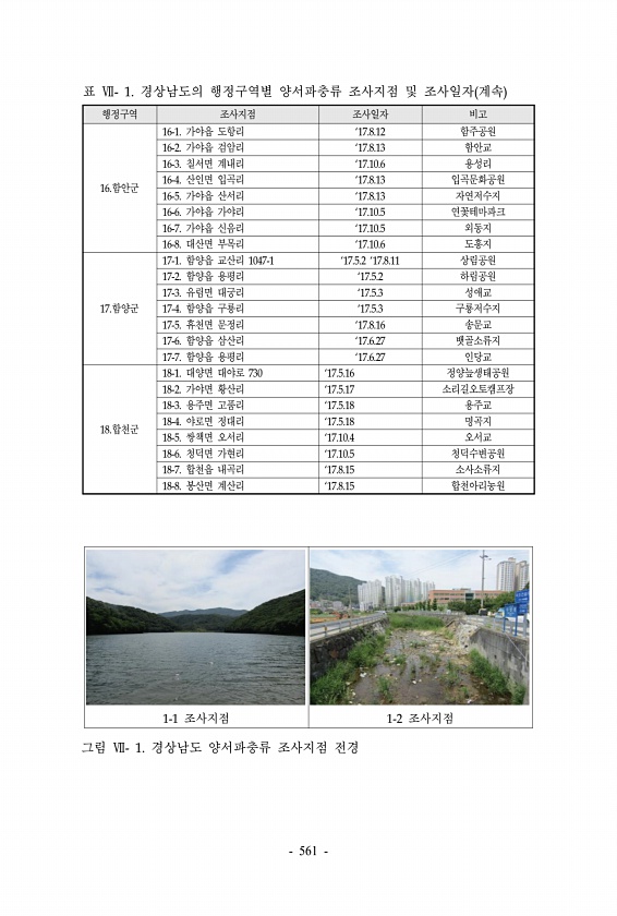 표 Ⅶ- 1. 경상남도의 행정구역별 양서파충류 조사지점 및 조사일자 계속 행정구역 조사지점 조사일자 비고 16.함안군 16-1. 가야읍 도항리 ‘17.8.12 함주공원 16-2. 가야읍 검암리 ‘17.8.13 함안교 16-3. 칠서면 계내리 ‘17.10.6 용성리 16-4. 산인면 입곡리 ‘17.8.13 입곡문화공원 16-5. 가야읍 산서리 ‘17.8.13 자연저수지 16-6. 가야읍 가야리 ‘17.10.5 연꽃테마파크 16-7. 가야읍 신음리 ‘17.10.5 외동지 16-8. 대산면 부목리 ‘17.10.6 도흥지 17.함양군 17-1. 함양읍 교산리 1047-1 ‘17.5.2 ‘17.8.11 상림공원 17-2. 함양읍 용평리 ‘17.5.2 하림공원 17-3. 유림면 대궁리 ‘17.5.3 성애교 17-4. ...