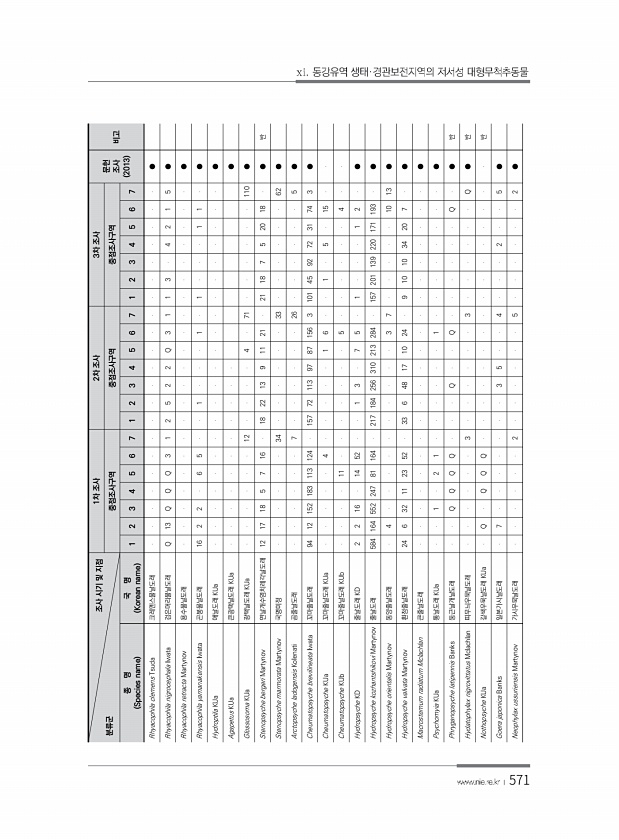 571 조사 시기 및 지점 분류군 1차 조사 2차 조사 3차 조사 문헌 조사 2013 중점조사구역 중점조사구역 중점조사구역 비고 종 명 Species name 국 명 Korean name 1 2 3 4 5 6 7 1 2 3 4 5 6 7 1 2 3 4 5 6 7 Rhyacophila clemens Tsuda 크레멘스물날도래 ● Rhyacophila nigrocephala Iwata 검은머리물날도래 Q 13 Q Q Q 3 1 2 5 2 2 Q 3 1 1 3 4 2 1 5 ● Rhyacophila retracta Martynov 용수물날도래 ● Rhyacoph...