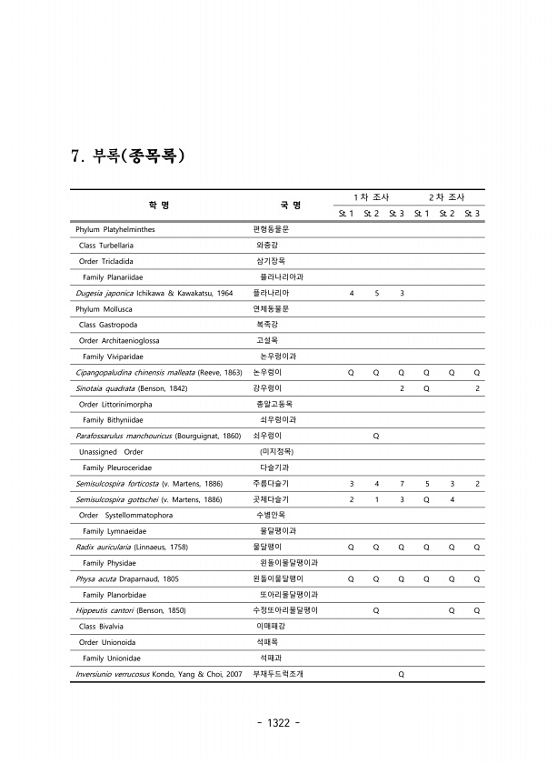 1322 7. 부록 종목록 학 명 국 명 1 차 조사 2 차 조사 St. 1 St. 2 St. 3 St. 1 St. 2 St. 3 Phylum Platyhelminthes 편형동물문 Class Turbellaria 와충강 Order Tricladida 삼기장목 Family Planariidae 플라나리아과 Dugesia japonica Ichikawa & Kawakatsu, 1964 플라나리아 4 5 3 Phylum Mollusca 연체동물문 Class Gastropoda 복족강 Order Architaenioglossa 고설목 Family Viviparidae 논우렁이과 Cipangopaludina chinensis malleata Reeve, 1863 논우렁이 Q Q Q Q Q Q Sinotaia qua...