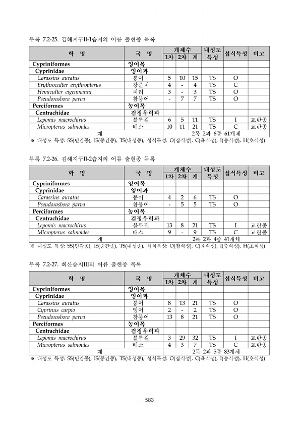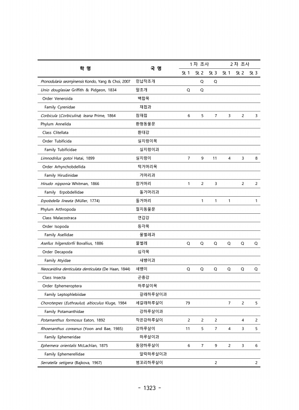 1323 학 명 국 명 1 차 조사 2 차 조사 St. 1 St. 2 St. 3 St. 1 St. 2 St. 3 Pronodularia seomjinensis Kondo, Yang & Choi, 2007 민납작조개 Q Q Unio douglasiae Griffith & Pidgeon, 1834 말조개 Q Q Order Veneroida 백합목 Family Cyrenidae 재첩과 Corbicula Corbiculina leana Prime, 1864 참재첩 6 5 7 3 2 3 Phylum Annelida 환형동물문 Class Clitellata 환대강 Order Tubificida 실지렁이목 Family Tubificidae 실지렁이과 Limnodrilus gotoi Hatai, 1899 실지렁이 7 9 ...