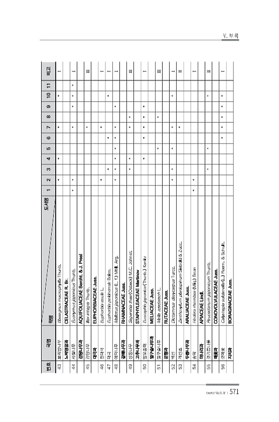 571 번호 국명 도서명 학명 1 2 3 4 5 6 7 8 9 10 11 비고 43 보리밥나무 Elaeagnus macrophylla Thunb. * * * * Ⅰ 노박덩굴과 CELASTRACEAE R. Br. 44 사철나무 Euonymus japonicus Thunb. * * * * * * Ⅰ 감탕나무과 AQUIFOLIACEAE Bercht. & J. Presl 45 감탕나무 Ilex integra Thunb. * Ⅲ 대극과 EUPHORBIACEAE Juss. 46 흰대극 Euphorbia esula L. * * Ⅰ 47 대극 Euphorbia pekinensis Boiss. * * * Ⅰ 48 예덕나무 Mallotus japonicus L. f. M?ll. Arg. * * * * * * * Ⅰ 갈매나무과...