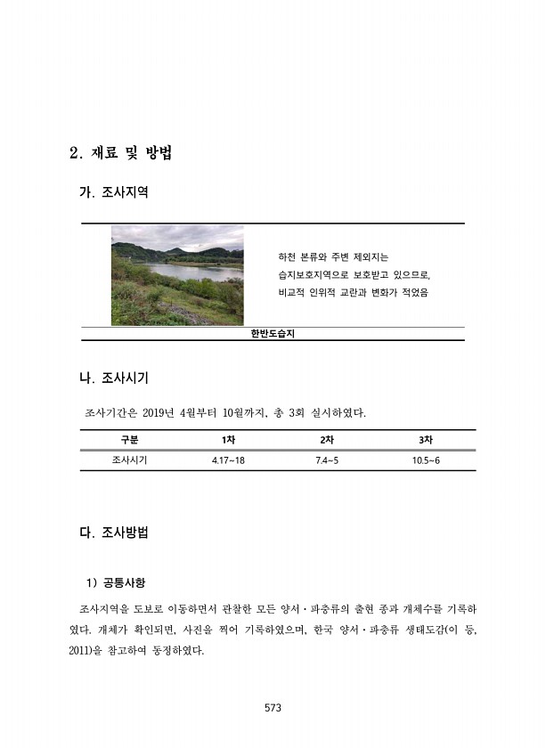 573 2. 재료 및 방법 가. 조사지역 하천 본류와 주변 제외지는 습지보호지역으로 보호받고 있으므로, 비교적 인위적 교란과 변화가 적었음 한반도습지 나. 조사시기 조사기간은 2019년 4월부터 10월까지, 총 3회 실시하였다. 구분 1차 2차 3차 조사시기 4.1718 7.45 10.56 다. 조사방법 1 공통사항 조사지역을 도보로 이동하면서 관찰한 모든 양서·파충류의 출현 종과 개체수를 기록하 였다. 개체가 확인되면, 사진을 찍어 기록하였으며, 한국 양서·파충류 생태도감 이 등, 2011 을 참고하여동정하였다.