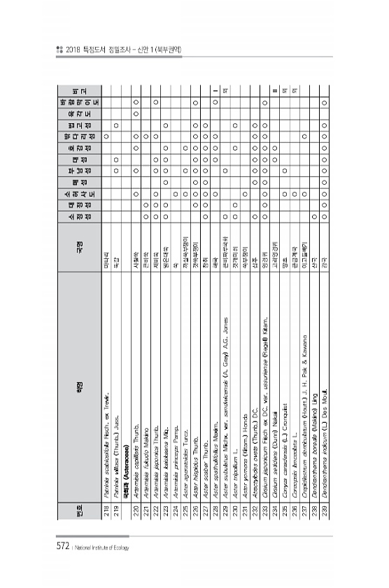 572 번호 학명 국명 소 정 섬 대 정 섬 소 허 사 도 매 섬 부 남 섬 대 섬 호 감 섬 밖 다 리 섬 법 고 섬 육 각 도 바 람 막 이 도 비 고 218 Patrinia scabiosifolia Fisch. ex Trevir. 마타리 O 219 Patrinia villosa Thunb. Juss. 뚝갈 O O O 국화과 Asteraceae 220 Artemisia capillaris Thunb. 사철쑥 O O O O O O 221 Artemisia fukudo Makino 큰비쑥 O O O 222 Artemisia japonica Thunb. 제비쑥 O O O O O O O 223 Artemisia keiskeana Miq. 맑은대쑥 O O O O O O O 224 Artemisia princeps...