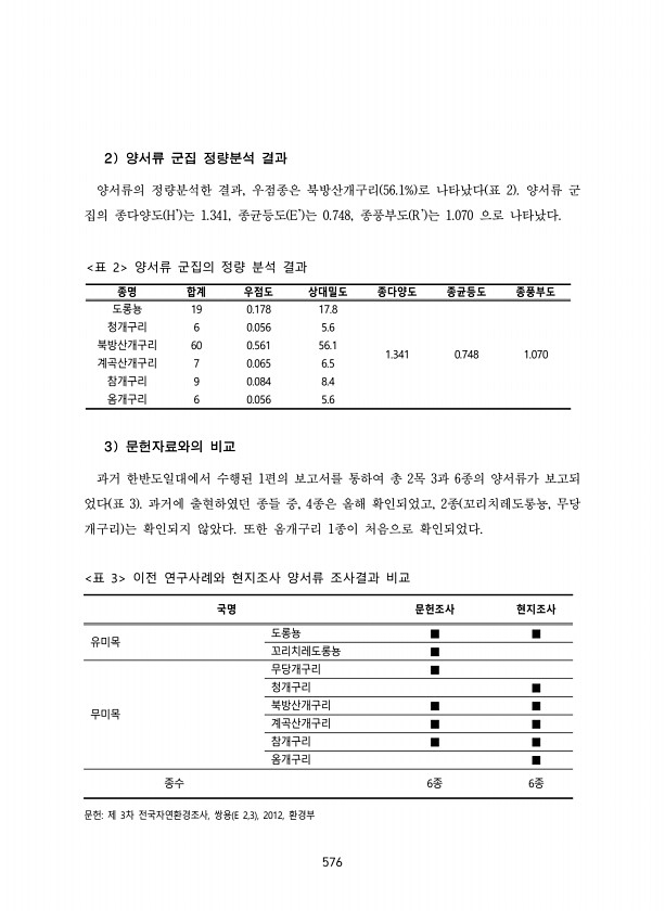 576 2 양서류 군집 정량분석 결과 양서류의 정량분석한 결과, 우점종은 북방산개구리 56.1% 로 나타났다 표 2 양서류 군 집의 종다양도 H는 1.341, 종균등도 E는 0.748, 종풍부도 R는 1.070 으로 나타났다. 종명 합계 우점도 상대밀도 종다양도 종균등도 종풍부도 도롱뇽 19 0.178 17.8 1.341 0.748 1.070 청개구리 6 0.056 5.6 북방산개구리 60 0.561 56.1 계곡산개구리 7 0.065 6.5 참개구리 9 0.084 8.4 옴개구리 6 0.056 5.6 표 2 양서류 군집의 정량 분석 결과 3 문헌자료와의 비교 과거 한반도일대에서 수행된 1편의 보고서를 통하여 총 2목 3과 6종의 양서류가 보고되 었다 표 3 과거에 출현하였던 종들 중, 4종은 올해 확인되었...
