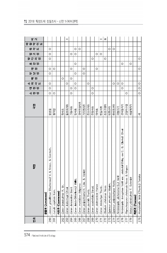 574 번호 학명 국명 소 정 섬 대 정 섬 소 허 사 도 매 섬 부 남 섬 대 섬 호 감 섬 밖 다 리 섬 법 고 섬 육 각 도 바 람 막 이 도 비 고 골풀과 Juncaceae 260 Juncus gracillimus Buchenau V. I. Krecz. & Gontsch. 물골풀 O O O O O O O O 261 Luzula capitata Kom. 꿩의밥 O O 사초과 Cyperaceae 262 Carex breviculmis R. Br. 청사초 O 263 Carex kobomugi Ohwi 통보리사초 O Ⅰ 264 Carex lanceolata Boott 그늘사초 O O O O O 265 Carex livida Wahlenb. Willd. 밀사초 O O O O O O 266 Carex merid...