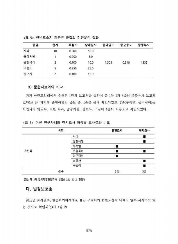 578 종명 합계 우점도 상대밀도 종다양도 종균등도 종풍부도 자라 10 0.500 50.0 1.303 0.810 1.335 줄장지뱀 1 0.050 5.0 유혈목이 2 0.100 10.0 구렁이 5 0.250 25.0 살모사 2 0.100 10.0 표 5 한반도습지 파충류 군집의 정량분석 결과 3 문헌자료와의 비교 과거 한반도일대에서 수행된 1편의 보고서를 통하여 총 1목 1과 3종의 파충류가 보고되 었다 표 6 과거에 출현하였던 종들 중, 1종은 올해 확인되었고, 2종 누룩뱀, 능구렁이 는 확인되지 않았다. 또한 자라, 줄장지뱀, 살모사, 구렁이 4종이 처음으로 확인되었다. 국명 문헌조사 현지조사 유린목 자라 ■ 줄장지뱀 ■ 누룩뱀 ■ 유혈목이 ■ ■ 능구렁이 ■ 살모사 ■ 구렁이 ■ 종수 3종 5종 표 6...