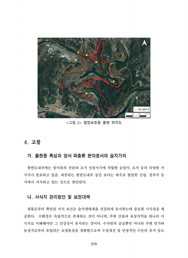 579 그림 2 법정보호종 출현 위치도 4. 고찰 가. 출현종 특성과 양서·파충류 분야로서의 습지가치 한반도내부에는 양서류의 산란과 초기 성장시기에 적합한 웅덩이, 초지 등의 다양한 서 식지가 분포하고 있음. 파충류는 한반도내부 공간 보다는 좌우로 발달한 산림, 경작지 등 지에서 서식하고 있는 것으로 판단된다. 나. 서식지 관리방안 및 보전대책 생물로부터 확인된 서식 조건은 습지생태계를 건강하게 유지하는데 중요한 시사점을 제 공한다. 수환경은 독립적으로 존재하는 것이 아니며, 주변 산림과 육상지역을 하나의 서 식지로 이해해야만 그 건강성이 유지되는 것이다. 수자원의 공급뿐만 아니라 주변 민가와 농경지로부터 유입되는 오염물질을 정화함으로써 수질개선 및 안정적인 수온의 유지등도
