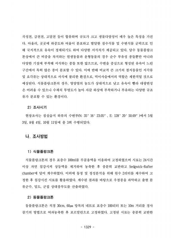 1329 곡성천, 금천천, 고달천 등이 합류하며 규모가 크고 생물다양성이 매우 높은 특징을 가진 다. 아울러, 곳곳에 하중도와 여울이 분포하고 발달한 침수식물 및 수변식물 군락으로 인 해 국지적으로 유속이 정체되기도 하여 다양한 서식처가 제공되고 있다. 담수 동물플랑크 톤상에서 큰 비중을 차지하는 원생동물과 윤형동물의 경우 순수 부유성 종들뿐만 아니라 다양한 기질에 부착해 서식하는 종들 또한 많으므로, 수변을 중심으로 형성된 유속이 느린 구간에서 특히 많은 종이 분포할 수 있다. 이에 반해 비교적 큰 크기의 절지동물인 지각류 및 요각류는 상대적으로 서식에 불리한 환경으로, 먹이사슬에서의 역할은 제한적일 것으로 예상된다. 식물플랑크톤의 경우, 영양염의 농도가 상대적으로 낮고 유속이 빨라 대량번성 은 어려울 수...