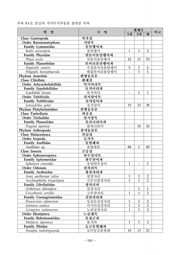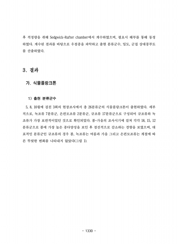 1330 후 적정량을 취해 Sedgwick-Rafter chamber에서 계수하였으며, 필요시 해부를 통해 동정 하였다. 계수된 결과를 바탕으로 우점종을 파악하고 출현 분류군수, 밀도, 군집 상대풍부도 를 산출하였다. 3. 결과 가. 식물플랑크톤 1 출현 분류군수 5, 8, 10월에 걸친 3회의 현장조사에서 총 26분류군의 식물플랑크톤이 출현하였다. 세부 적으로, 녹조류 7분류군, 은편모조류 2분류군, 규조류 17분류군으로 구성되어 규조류와 녹 조류가 가장 보편적이었던 것으로 확인되었다. 봄가을의 조사시기에 걸쳐 각각 18, 15, 12 분류군으로 봄에 가장 높은 종다양성을 보인 후 점진적으로 감소하는 경향을 보였으며, 대 표적인 분류군인 규조류의 경우 봄, 녹조류는 여름과 가을 그리고 은편모조류는 계절에 ...