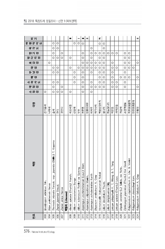 576 번호 학명 국명 소 정 섬 대 정 섬 소 허 사 도 매 섬 부 남 섬 대 섬 호 감 섬 밖 다 리 섬 법 고 섬 육 각 도 바 람 막 이 도 비 고 303 Spodipogon sibiricus Trin. 큰기름새 O 304 Stipa pekinensis Hance 나래새 O 305 Themeda triandra Forssk. ssp. japonica Willd. T. Koyama 솔새 O O O O O O O O O 306 Zoysia japonica Steud. 잔디 O O O O O O O 307 Zoysia sinica Hance 갯잔디 O O O O 백합과 Liliaceae 308 Aletris spicata Thunb. Franch. 쥐꼬리풀 O O O Ⅲ 309 Allium macroste...
