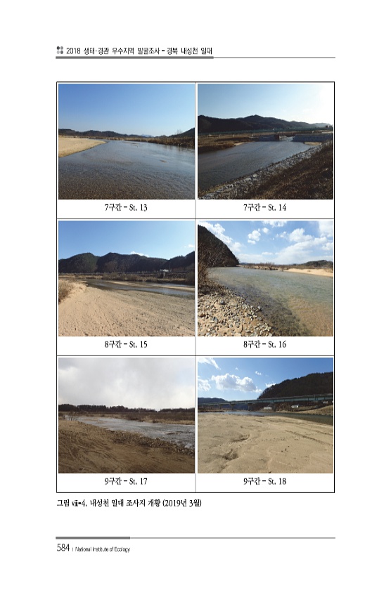 2018 생태·경관 우수지역 발굴조사 경북 내성천 일대 584 ? National Institute of Ecology 7구간 ? St. 13 7구간 ? St. 14 8구간 ? St. 15 8구간 ? St. 16 9구간 ? St. 17 9구간 ? St. 18 그림 ⅷ-4. 내성천 일대 조사지 개황 2019년 3월