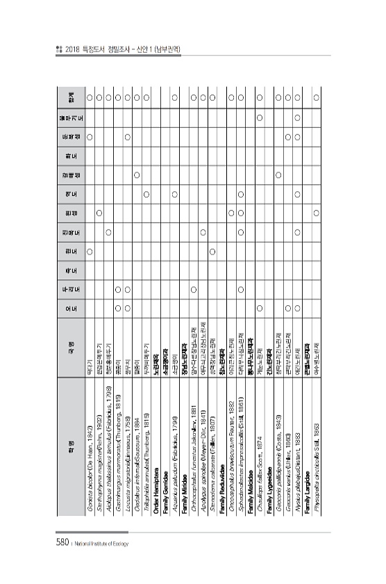 580 학 명 국 명 오 도 두리도 죽도 원도 진목도 왼섬 역도 갈매섬 화도 둔북섬 불무기도 합계 Gonista bicolor De Haan, 1842 딱다기 ? ? ? Stethophyma magister Rehn, 1902 끝검은메뚜기 ? ? Aiolopus thalassinus tamulus Fabricius, 1798 청분홍메뚜기 ? ? Gastrimargus marmoratus Thunberg, 1815 콩중이 ? ? ? Locusta migratoria Linnaeus, 1758 풀무치 ? ? ? ? Oedaleus infernalisSaussure, 1884 팥중이 ? ? Trilophidia annulata Thunberg, 1815 두꺼비메뚜기 ? ? Order Hemiptera 노린재목 F...