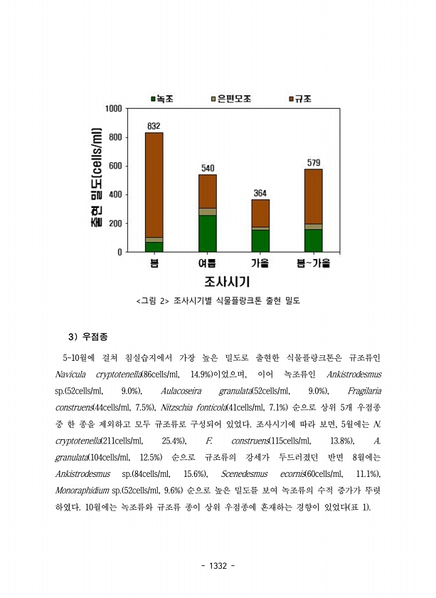 1332 그림 2 조사시기별 식물플랑크톤 출현 밀도 3 우점종 510월에 걸쳐 침실습지에서 가장 높은 밀도로 출현한 식물플랑크톤은 규조류인 Navicula cryptotenella 86cells/ml, 14.9% 이었으며, 이어 녹조류인 Ankistrodesmus sp. 52cells/ml, 9.0% , Aulacoseira granulata 52cells/ml, 9.0% , Fragilaria construens 44cells/ml, 7.5% , Nitzschia fonticola 41cells/ml, 7.1% 순으로 상위 5개 우점종 중 한 종을 제외하고 모두 규조류로 구성되어 있었다. 조사시기에 따라 보면, 5월에는 N. cryptotenella 211cells/ml, 25.4% , F. constru...