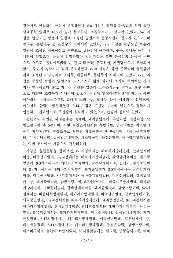 viii. 어 류 www.nie.re.kr ?585 3 1구간 St.1은 미림교 인근 지점으로 미림교 아래쪽으로 돌보가 축조되어 있었으며, 보 아래쪽으로 짧은 여울부가 형성되어 있었다. 하폭은 150170m, 유폭은 4050m, 수심 은 0.20.8m 의 범위를 나타냈다. 수변부에는 달뿌리풀이 서식하고 있었으며, 하상은 모래가 70%를 차지하고 있었으며, 여울부는 크고 작은 돌과 자갈로 이루어져 있었다. 하 상에 유기물이 많이 퇴적되어 있었으며, 물은 비교적 탁했다. St.2는 수도교 인근 지점으 로 하폭은 150170m, 유폭은 4050m, 수심은 0.30.7m 의 범위를 나타냈다. 수변부 에는 달뿌리풀이 서식하고 있었으며, 하상은 모래가 85%를 차지하고 있었으며, 일부 유 속이 빠른 지역은 자갈이 드러...