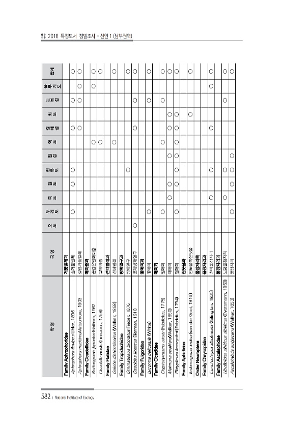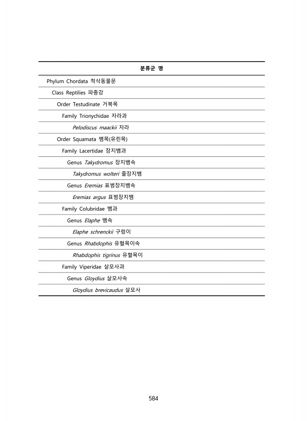 584 분류군 명 Phylum Chordata 척삭동물문 Class Reptilies 파충강 Order Testudinate 거북목 Family Trionychidae 자라과 Pelodiscus maackii 자라 Order Squamata 뱀목 유린목 Family Lacertidae 장지뱀과 Genus Takydromus 장지뱀속 Takydromus wolteri 줄장지뱀 Genus Eremias 표범장지뱀속 Eremias argus 표범장지뱀 Family Colubridae 뱀과 Genus Elaphe 뱀속 Elaphe schrenckii 구렁이 Genus Rhabdophis 유혈목이속 Rhabdophis tigrinus 유혈목이 Family Viperidae 살모사과 Genus Gloydius 살모사속...